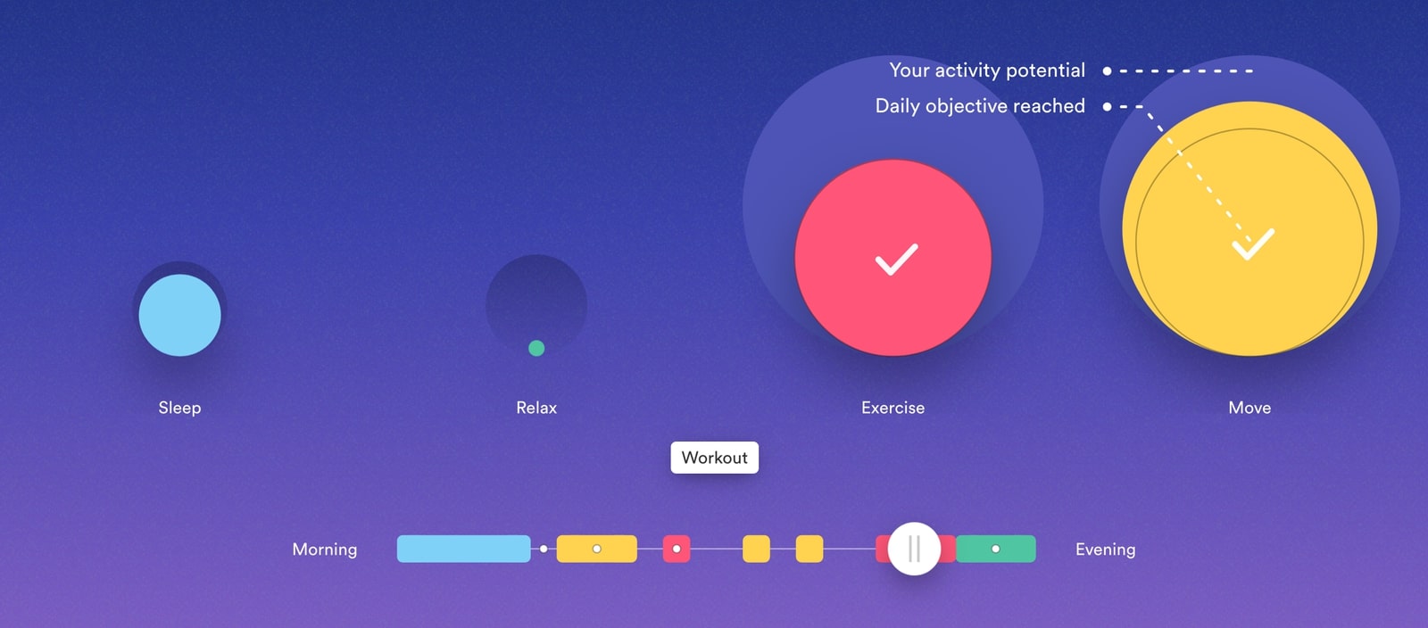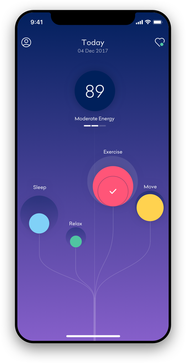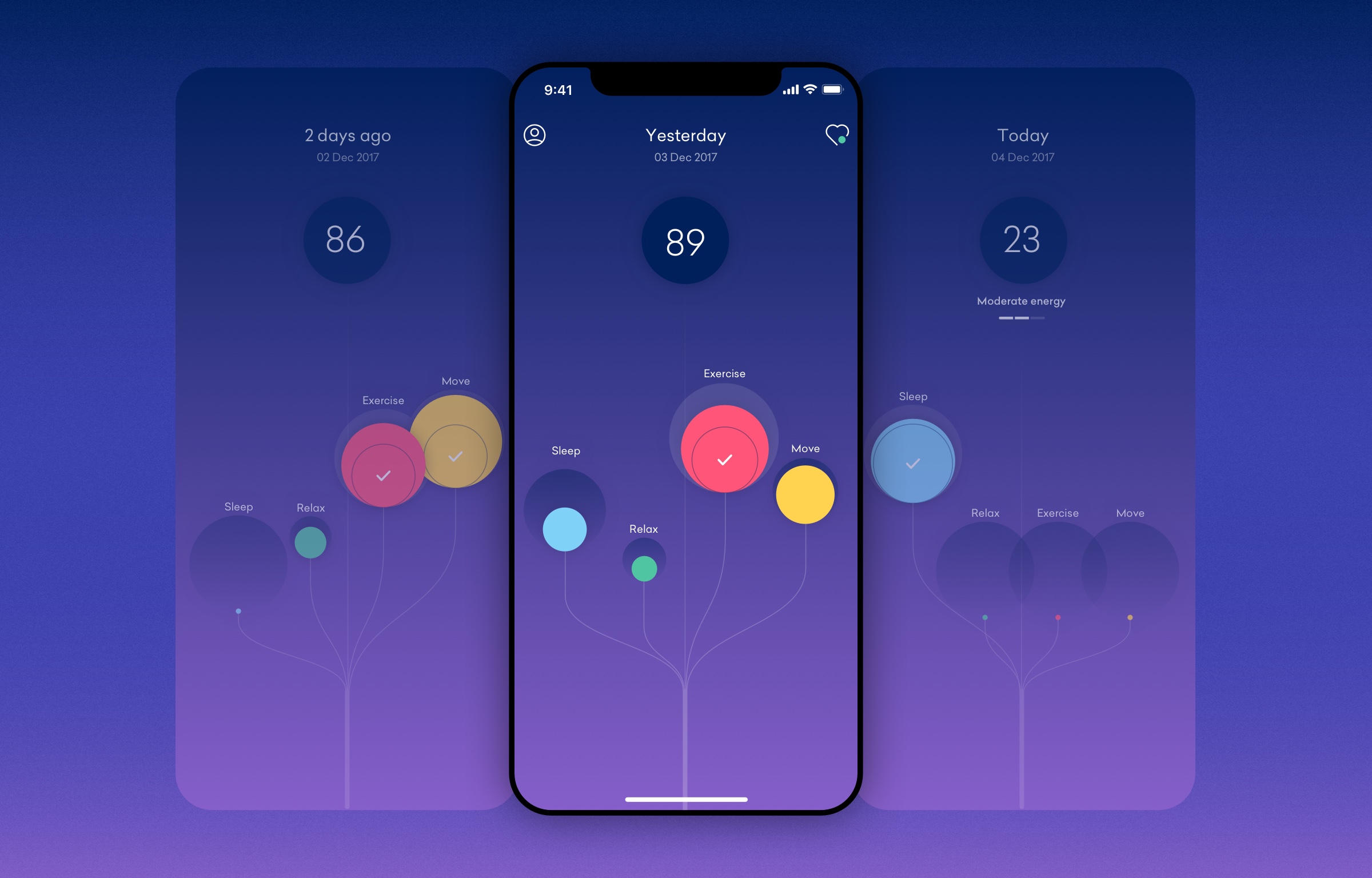Knowing which activity to invest your time and effort is key to achieving your objectives and potential. We designed a simple representation of a user’s daily activity agenda. Intuitive and immediate, the design blossoms throughout the day providing goals and recommendations that are unique to each user’s personal needs.