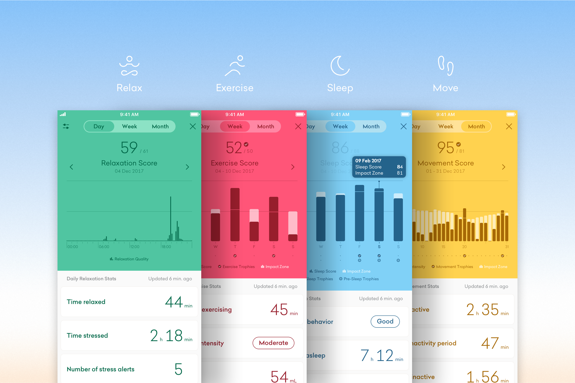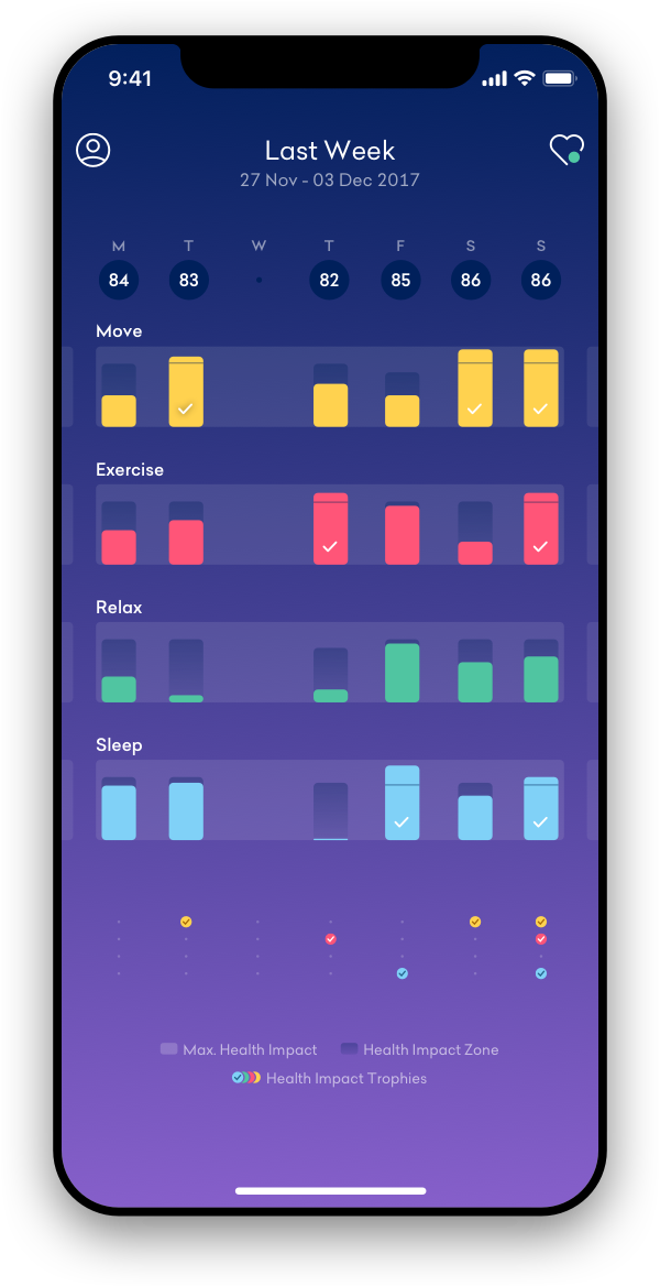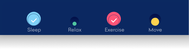 To generate sustainable outcomes for better personal health, we visualize a user’s movement, exercise, relaxation and sleep on different time scales: daily, weekly, and monthly. These three views foster an understanding of a user’s current health status as well as the long term impact of habits and behaviors.