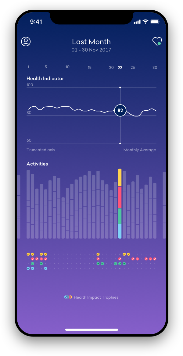 The application measures data on four physical activities which contribute to the user’s overall health indicator. We designed dedicated views for each of these activities, allowing the user to drill-down into the data of each of these individually. The different views enable a self-directed analysis of statistical information and progression over time in addition to offering guided insights calculated by artificial intelligence.