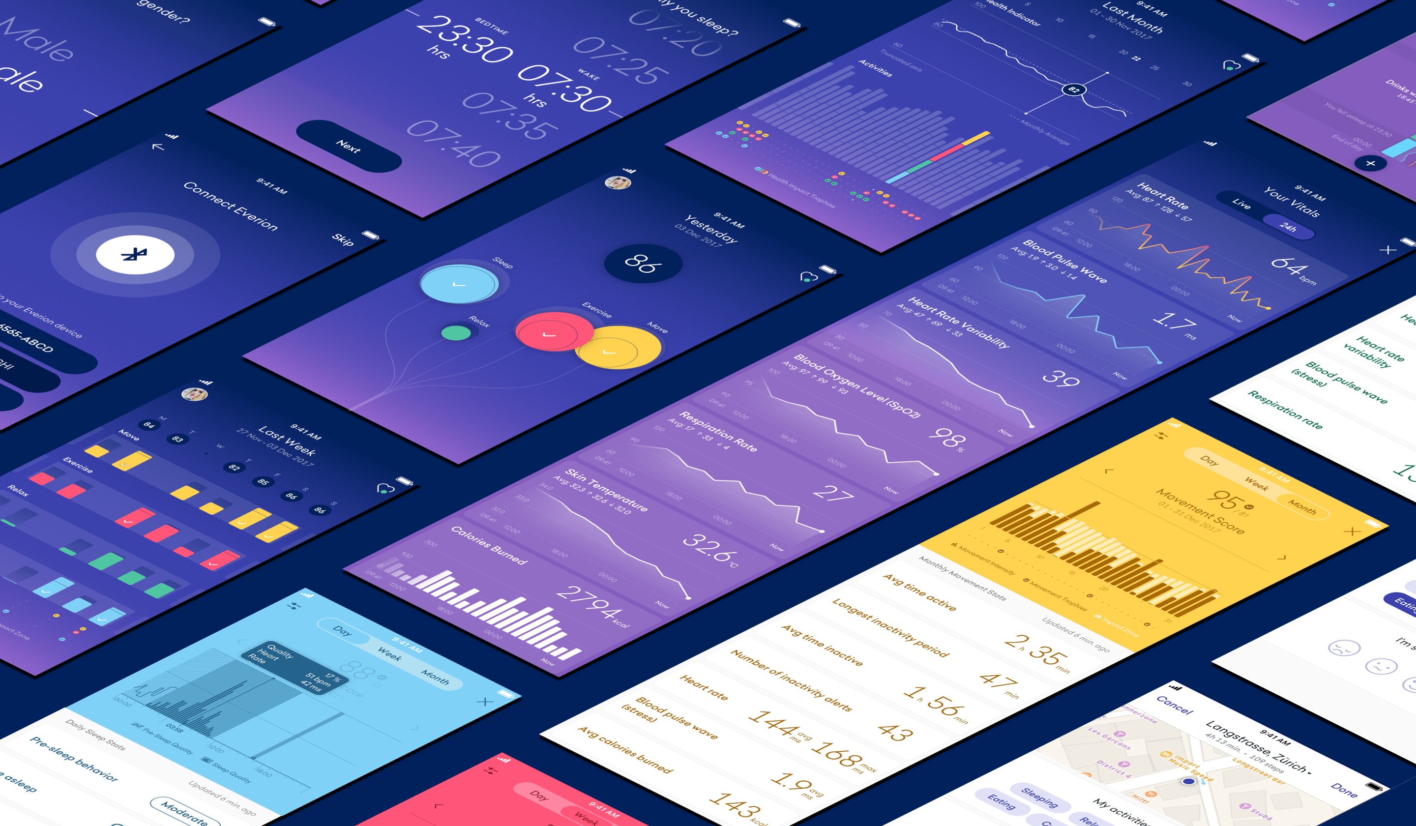 Augment helps people understand and act upon their medical data. Collected by «Everion», a wearable device capable of measuring a wide range of health parameters (e.g. heart rate, blood oxygenation, motion, etc.), Augment provides a high-level overview of a user’s health status and presents personalized objectives in the form of daily goals.