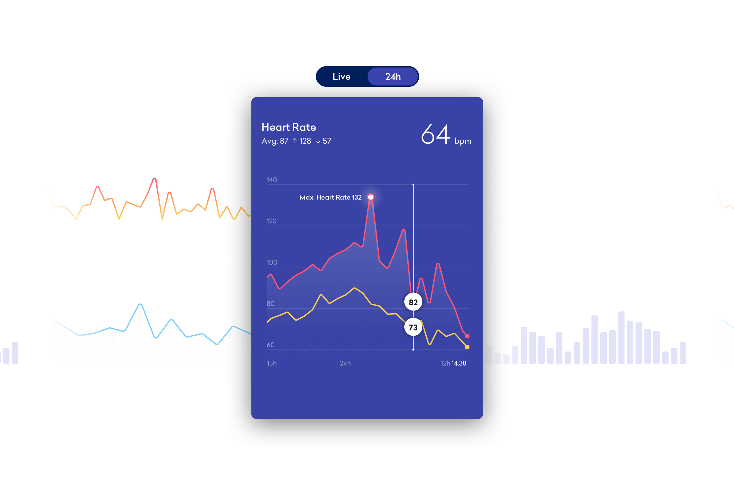Measuring a wide range of parameters, the Augment application includes a comprehensive vital signs view, that provides the user with accurate insights. Each vital sign is represented as a card composed of real-time measurements, customizable time-series, and helpful statistics. By switching between a «Live» and «24h» view, the focus shifts from a summary overview to a detailed, exploratory visualization.